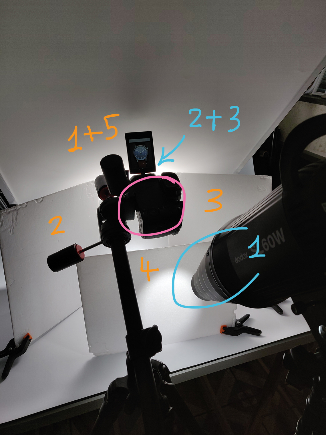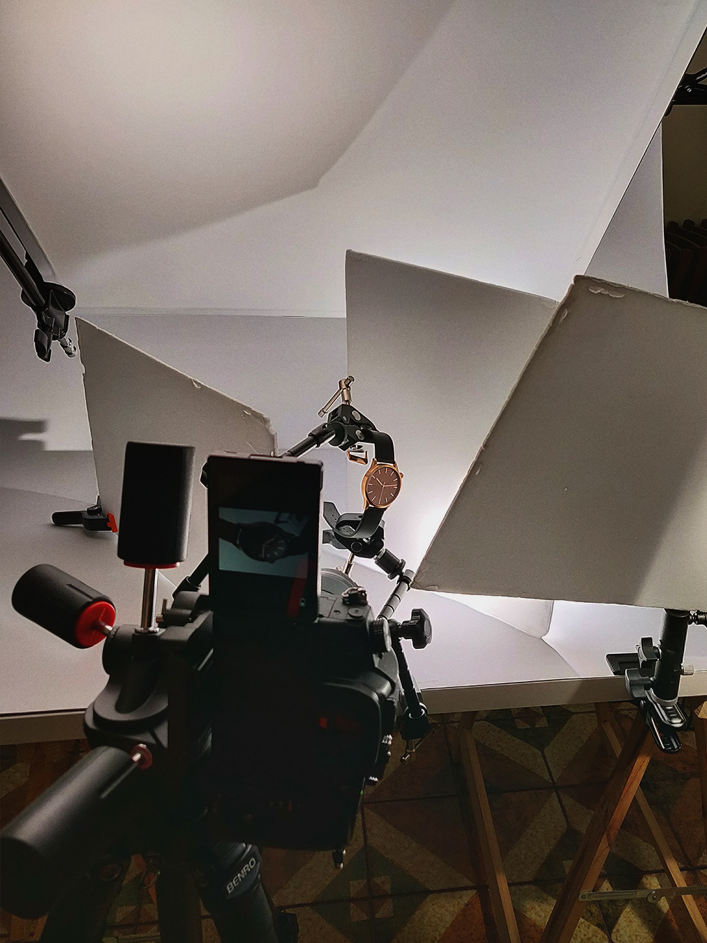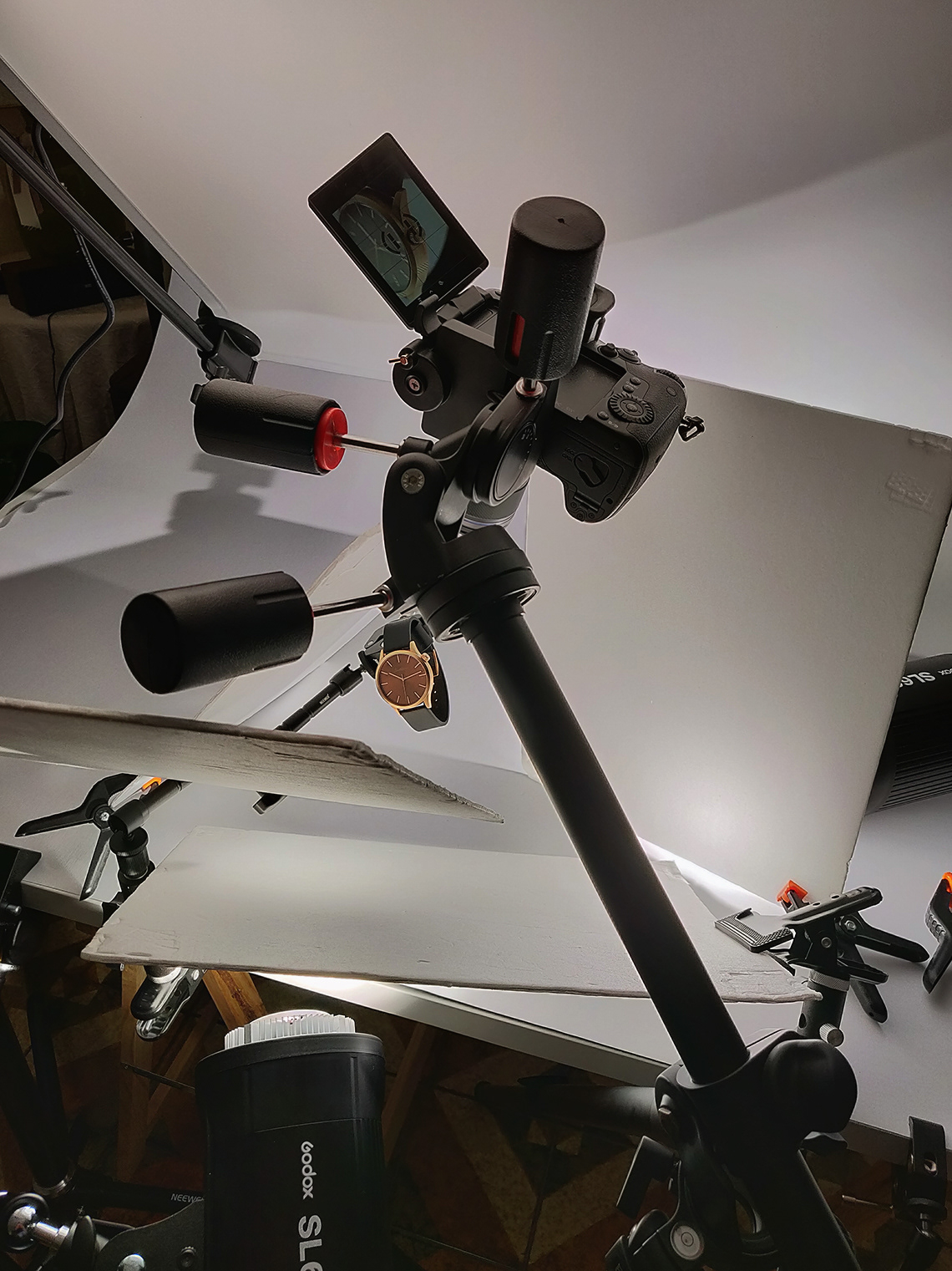 The watch was held in place by a pair of Neewer magic arm and clamps.